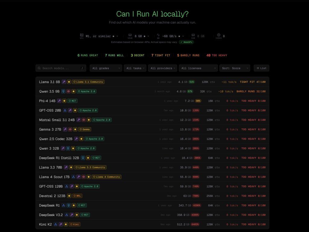 La clave está en que la herramienta no se presenta como un benchmark tradicional ni como un simple catálogo de modelos. Su planteamiento es más pragmático. CanIRun.ai calcula estimaciones en local, dentro del propio navegador, usando APIs web para identificar GPU, CPU y memoria, y después aplica una fórmula de puntuación que combina velocidad estimada, margen de memoria y un pequeño extra por tamaño o calidad potencial del modelo. Todo ello, además, sin enviar esos datos a un servidor, según explica la propia página “Why” del servicio.