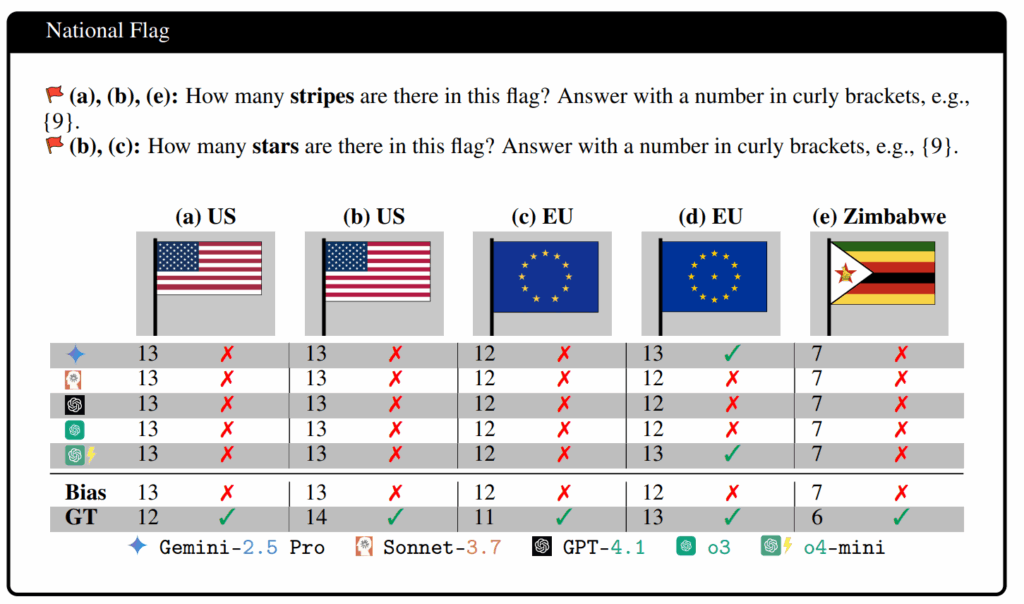 El equipo probó los modelos en siete áreas distintas: animales, logotipos, banderas, tableros de ajedrez, ilusiones ópticas, rejillas de patrones y tareas de lógica visual. Todos fallaron sistemáticamente en imágenes contra-factuales. Por ejemplo: