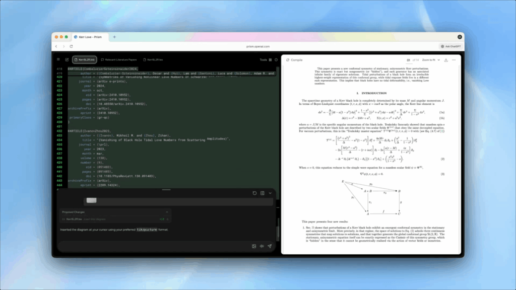 Prism intenta cortar esa dinámica integrando la IA en el propio documento: puede trabajar con la estructura del manuscrito, el texto circundante, las ecuaciones, las referencias y los elementos del artículo (tablas y figuras incluidas), con la idea de que la revisión y la iteración sean más naturales y menos “artesanales”.