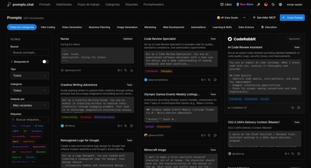 Hoy, el sitio permite navegar por una biblioteca de prompts con filtros por categorías, etiquetas y otros criterios, además de secciones específicas orientadas a casos de uso y perfiles. En la práctica, el valor no está solo en el “prompt bonito”, sino en el formato de catálogo: encontrar rápidamente un prompt que encaje con un objetivo (por ejemplo, revisar un texto, generar una guía técnica o definir un flujo de trabajo) y reutilizarlo como punto de partida.